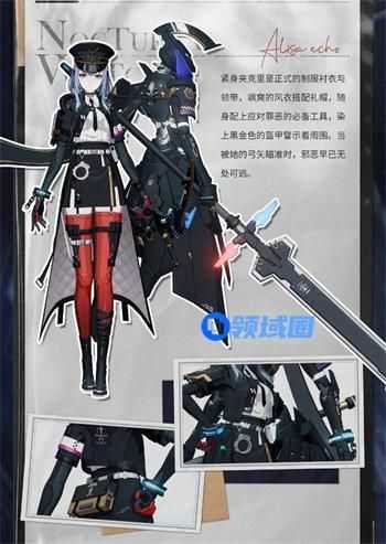 紧身夹克里是正式的制服衬衣与领带,飒爽的风衣搭配礼帽,随身配上应对罪恶的必备工具,染上黑金色的盔甲警示着周围。当被她的弓矢瞄准时,邪恶早已无处可逃。