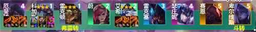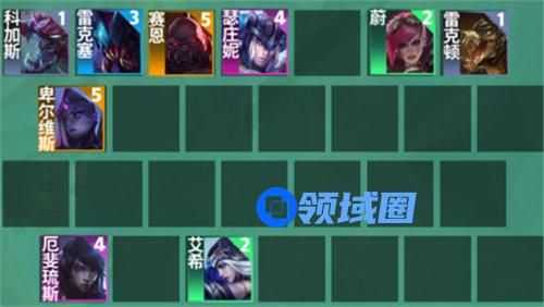 1、阵容组成:厄斐琉斯、科加斯、雷克顿、蔚、艾希、雷克塞、瑟庄妮、塞恩、卑尔维斯