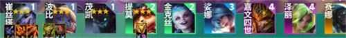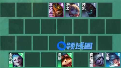 1、阵容组成:崔丝塔娜、波比、茂凯、提莫、金克丝、娑娜、嘉文四世、泽丽、赛娜