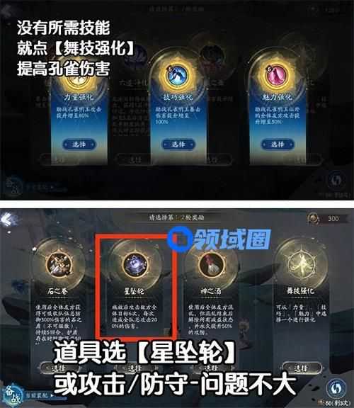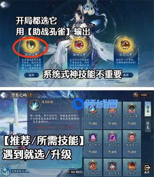 - 过程推荐技能[流羽剑术][倾城之舞][六道轰雷],没有这些技能就选[舞技强化],提高助战孔雀的伤害
