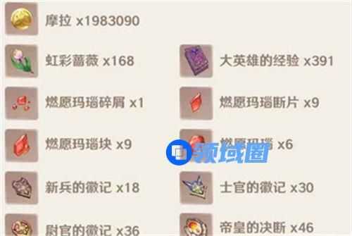 【70级突破材料】摩拉100000、燃愿玛瑙块6帝皇的决断12、虹彩蔷薇45、尉官的徽记12。