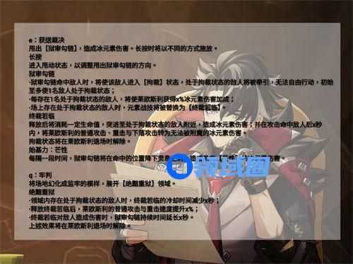 3、该角色主打E技能,二段e和冰附魔都得由e来获取。