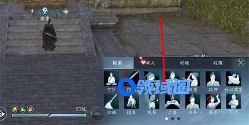 3、然后在表情动作选择探索栏目,找到上香动作按钮。