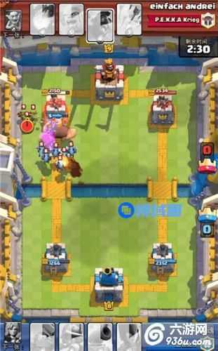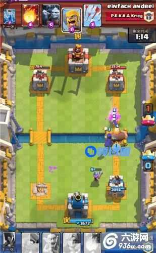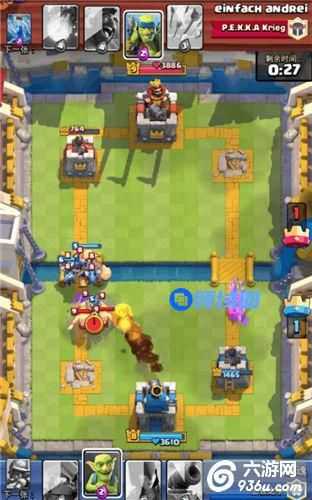 可以看到,对面扔了野猪加哥布林,为什么要扔女武呢?主要是为了把哥布林解决,哥布林伤害比野猪高多了,其次可以反场一波,给对面巨大的压力。