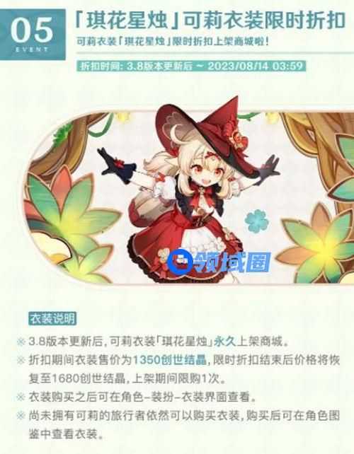 1、3.8版本更新后可莉衣装琪花星烛就会上线。