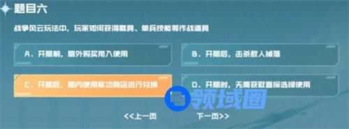 6、问题:战争风云玩法中,玩家如何获得载具、单兵技能等作战道具?(C,开局后,局内使用军功商店进行兑换)