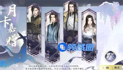 2、立即购买月卡后,可获得300纹玉和20000铜钱,而且玩家在月卡期间内,每天都可以领取100绑定纹玉。