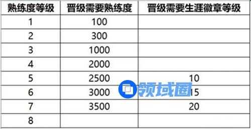 2、熟练度等级从5级开始,除了熟练度数值外,玩家还需提升自己的生涯徽章等级。