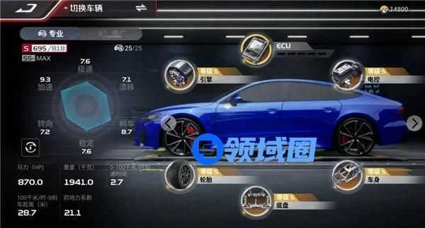 由于RS7是传说级车辆,改装需求资源较多,这里推荐重点改装引擎、电控和车身三大方面,重点提升车辆的极速、加速能力,性价比更高。