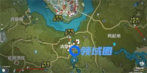 4、如图所示,在蒙德城中有二十五个,清泉镇有欧十八个,风起地右侧的传送点附近可以买到五个,最后在晨曦酒庄附近可以采集七个。