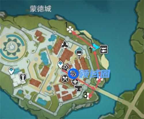 1、蒙德城城门口,路线如下,可以采集9个。