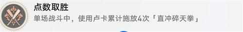 点数取胜是游戏中非常好完成的一个成就,只要玩家拥有卢卡这个角色,在战斗中释放4次直冲碎天拳即可,简单来说就是触发被动后的强化普攻,在刷血厚的敌人时,轻松完成这个成就,提前是卡池中得到该角色。崩坏星穹铁道是一款零氪玩家绝对能畅玩的回合制游戏,游戏福利发放多,画面精致好看,人物的3d建模技术超越目前市面上的所有二次元游戏,剧情演出令人震撼,画面没有不舒服的地方,角色配音的选择也恰到好处,使得整体的游玩体验好了不止一点点,接下来为大家介绍一下崩坏星穹铁道点数取胜成就解锁攻略。