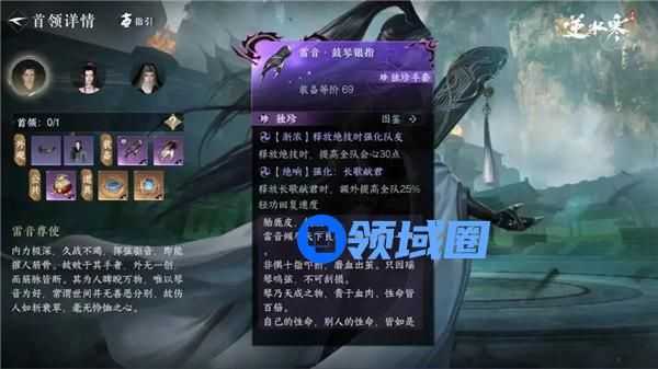 击败雷音尊使后,有概率掉落独珍装备【雷音·鼓琴银指】,由雷音倾尽天下良材铸造的指套。穿戴后,释放绝技可提升全队会心,若释放绝技【长歌献君】时,还将额外提高队友的轻功回复速度。