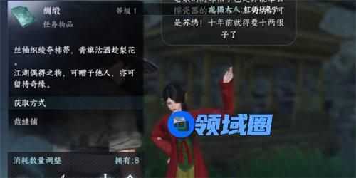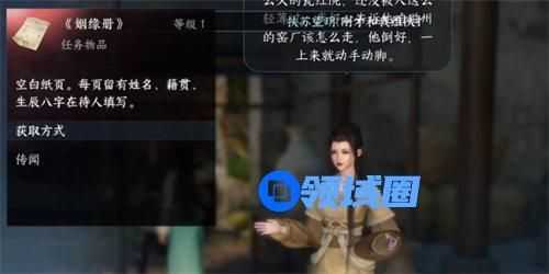 2、我们将一条绸缎交给需要它的裘碧唐,之后我们再和她对话从她手中得到一本册子帮她挑选出色的女孩。