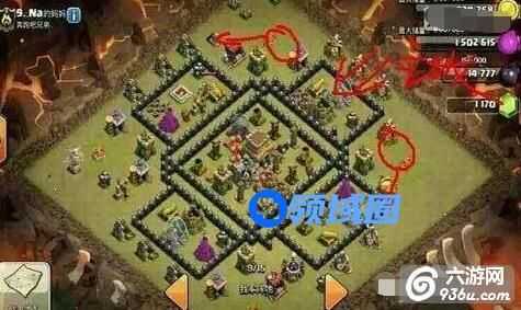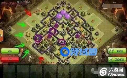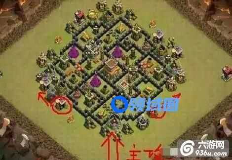 清边讲过,再来讲讲进攻方向的选择。一般情况下选择三个防空形成的三角形顶点方向作为主攻方向。选定进攻方向的时候,需要考虑以下几点:城堡的位置、男王的位置、空气炮位置、防空位置。为什么要考虑城堡和男王的位置呢?首先这个游戏中的兵种是有仇恨值存在的,当敌方城堡援兵或者男王在龙的一定范 围之内的时候,龙会放弃眼前的进攻目标而去攻击城堡援兵或男王,所以城堡的位置和男王的位置也要事先考虑进去。关于空气炮的位置,其实是有些鸡肋了,暴力龙的特点是输出高,推进快,其实你吹我的那几下并不能让我多被防空点几下。再来一张图吧,图片实在不好找: