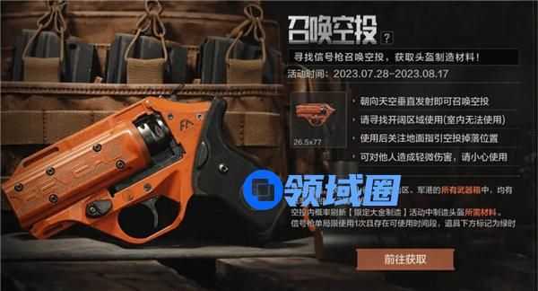 使用MK3信号枪对天空发射即可召唤空投。空投内将概率刷新【限定大金制造】活动中制造头盔所需材料:【制造图纸】、【锻造钢板】、【合金铸块】。