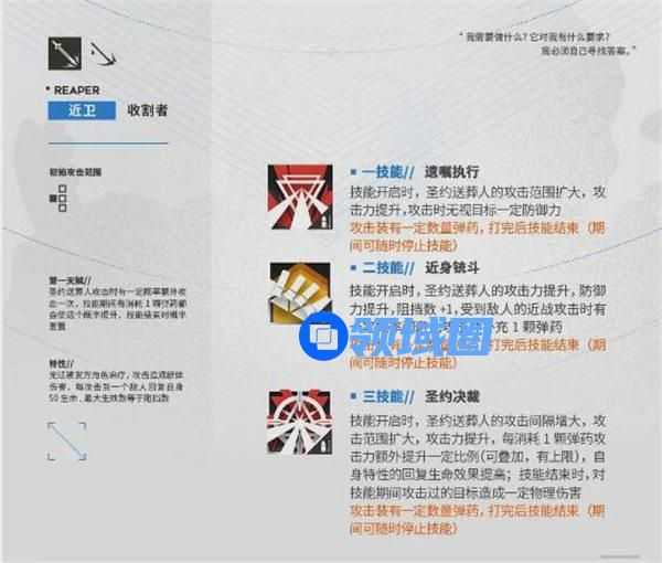 技能开启时,圣约送葬人的攻击力提升,防御力提升,阻挡数+1,受到敌人的近战攻击时有一定概率闪避此攻击并补充1颗弹药
