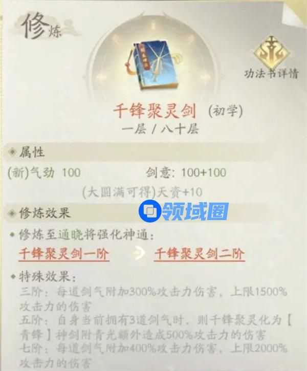● 五阶:自身当前拥有3道剑气时,则千锋聚灵化为【青锋】神剑附青光额外造成500%攻击力的伤害