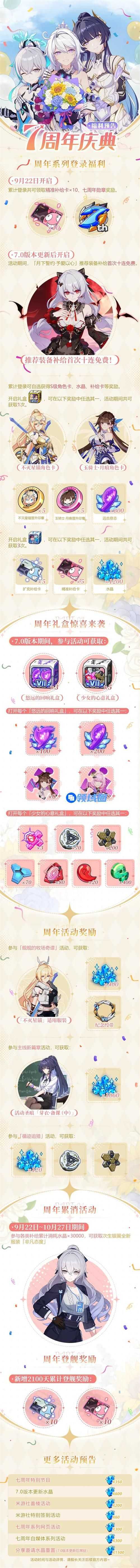 9月22日起,舰长参与系列登录活动,可获得精准补给卡、七周年纪念勋章、自选S级角色、自选补给卡/水晶奖励。 在7.0版本更新后,抽取「月下誓约·予爱以心」推荐装备补给,首次十连免费! 另外参与版本活动,舰长还可以获得水晶、「不灭星锚」全新服装、4活动圣痕、「星辉缀海」纪念绶带等,更有悠远的回响礼盒、少女的心意礼盒,打开可获得大量材料! 更多福利详情,请舰长查看下方图片吧~