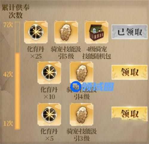※ 累计供奉4次 —— 化育丹*10、骑宠·技能汲引4级*1;