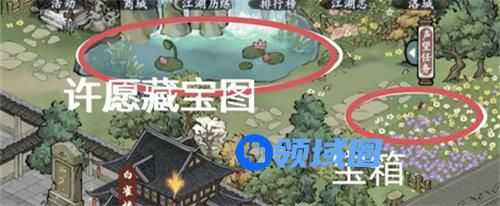 在洛城白雀楼右上角有一个”瀑布许愿池“,玩家在许愿池右侧的花丛中可以找到宝箱。