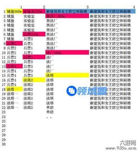 1、建法术工厂,罐子,升级城堡,群杀建筑,暗黑训练营(一个即可),防空(防龙),大炸(防猪),