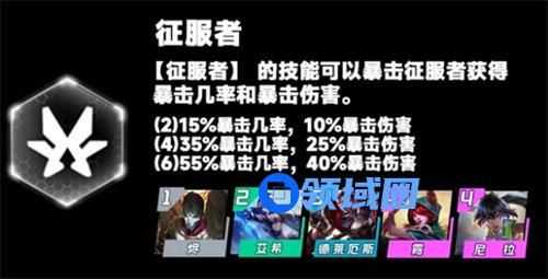 一、羁绊介绍:【征服者】的技能可以暴击,征服者获得暴击几率和暴击伤害。