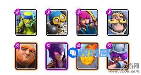 哥布林投矛+炸弹人+弓箭手+骑士+巨人+女巫+火球+火枪手