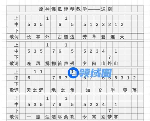 以上就是原神送别歌曲琴谱一览的全部内容,希望能够帮助到看过这篇资讯的你,想要获取更多精彩内容收藏领域圈即可,你的关注是我更新的动力!