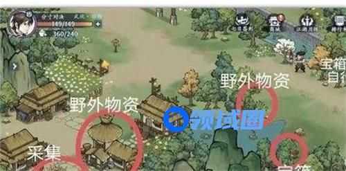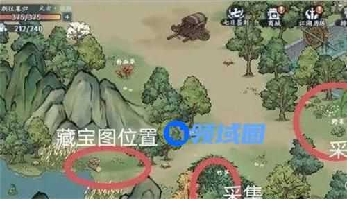 1、进入村子时,我们可以在上方树林找到藏宝图位置,然后再下面会依次有采集、试炼以及两个宝箱。