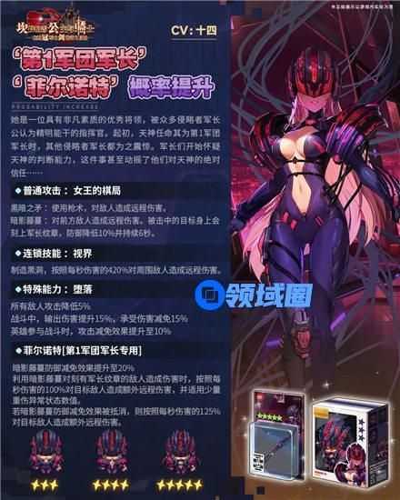 她是一位具有非凡素质的优秀将领,被众多侵略者军长公认为精明能干的指挥官。起初,军长们对其能力抱有怀疑态度。后来,她在执行被委派的作战任务时,以卓越的表现证明了自己超凡的指挥能力与惊人的战斗力。特别是在魔界突袭战中,侵略者军长们在亲眼见识到了她展现出“可以预知未来一般”的能力后,不得不承认她配得上军长的职位。