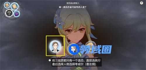 前三线索只有一个选项,直接选就行。最后选择人物时,选择考威尔(最左侧人物)