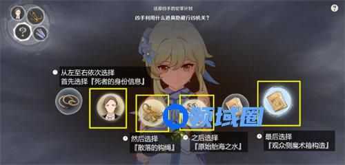 首先选择『死者的身份信息』(左起第二个),然后选择『散落的钩绳』(左起第三个),之后选择『原始胎海之水』(左起第四个),最后选择『观众侧魔术箱构造』(最右侧选项)。如下图。