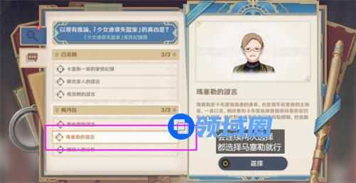 在经过一个很长的剧情后,会出现一个列表选择,选择『玛塞勒的证言』就行,如下图