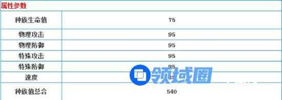 再来看种族值,第一印象就是平衡,攻击防御属性都是95,生命75有点低 速度85一般般,总体来说双抗是比较不错的。