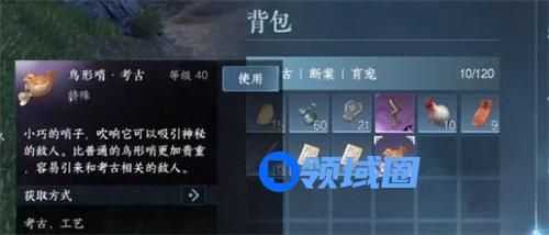 4、打开背包,在身份-考古-断案-育宠中可以看到鸟形哨。