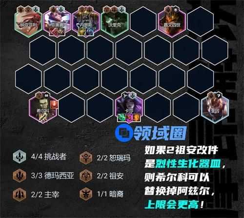 小贴士:如果2祖安改件是烈性生化器皿,则希尔科可以替换掉阿兹尔,希尔科技能范围大,与烈性生化器皿搭配,能增加18%的伤害,能增强队伍的输出强度,还能为前排提供生命回复,增强队伍续航能力。