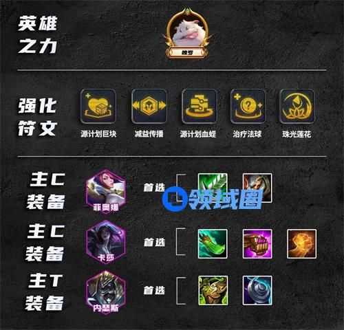 这套阵容对装备需求不算太高,3德玛西亚给菲奥娜提供1件光明装备(斯特拉克的究极盾牌),我们只需要再给她找2件装备就行。