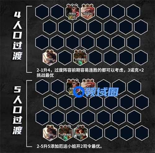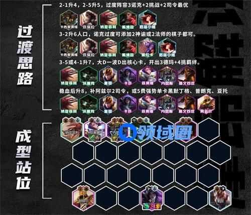 2-1升4,2-5升5,过度阵容3诺克+2挑战+2司令最优,其他如3艾欧、3虚空、3德玛西亚,前期容易连胜的都可以考虑,主打一个灵活看对局选择打工卡。
