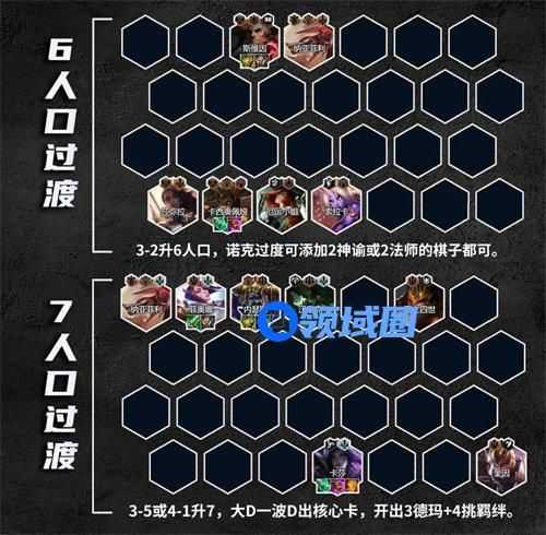 3-2升6人口,打工阵容如诺克萨斯过度可添加2神谕或2法师的棋子都可。