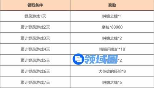 活动规则:在这个活动期间,玩家们只要累计登陆的七天就能够获得精锻用魔矿、大英雄的经验以及纠缠之缘等等的奖励;
