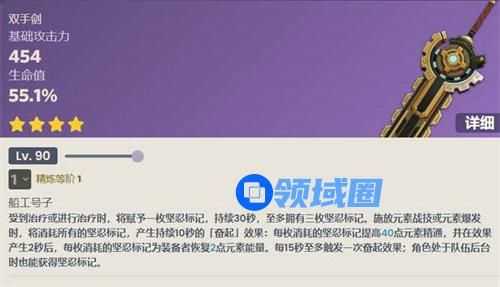 2、武器特效: 受到治疗或进行治疗时,将赋予一枚坚忍标记,持续30秒,至多拥有三枚坚忍标记。施放元素战技或元素爆发时,将消耗所有的坚忍标记,产生持续10秒的「奋起」效果:每枚消耗的坚忍标记提高40点元素精通,并在效果产生2秒后,每枚消耗的坚忍标记为装备者恢复2点元素能量。