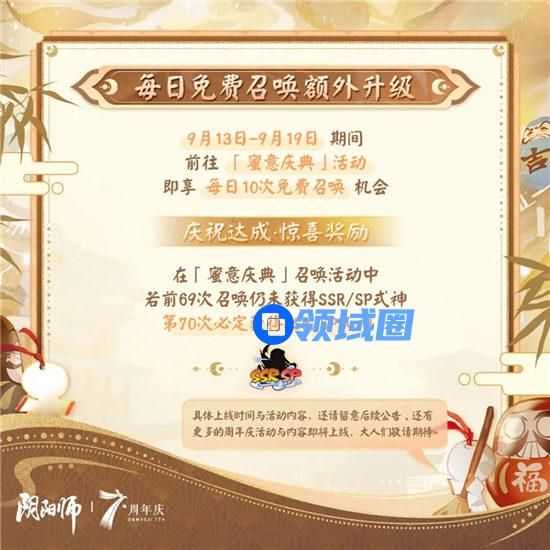 ※9月13日-9月19日,前往「蜜意庆典」即享每日10次免费召唤机会,70次内必定获得SSR/SP式神!