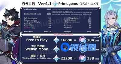 我们来看一下4.1大致能够获得的原石数量。非氪金党玩家可以获得104抽,小月卡党玩家可获得130抽,大月卡玩家可获得138抽。不过要注意,如果说玩家不去完成签到活动,深渊奖励没有拿满的话,获取数量相对来说会减少哦。