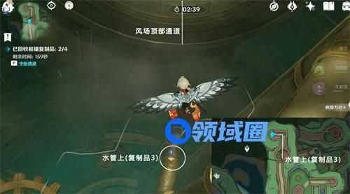 按指引路线走,前往水管位置,进入风场,在风场中间位置的水管上,回收复制品3,进入风场,前往风场顶部通道。