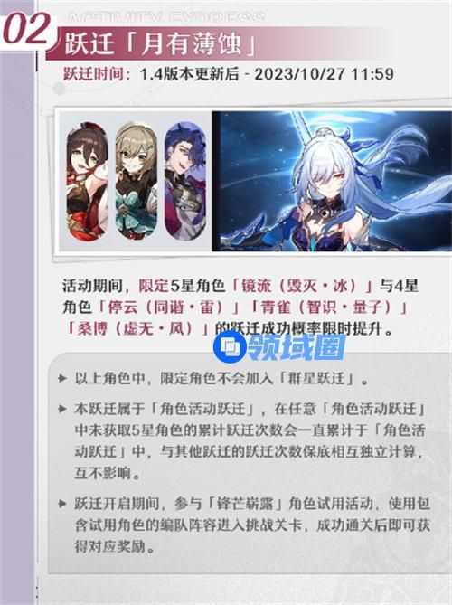 活动期间,限定5星角色「镜流(毁灭·冰)」与4星角色「停云(同谐·雷)」「青雀(智识·量子)」