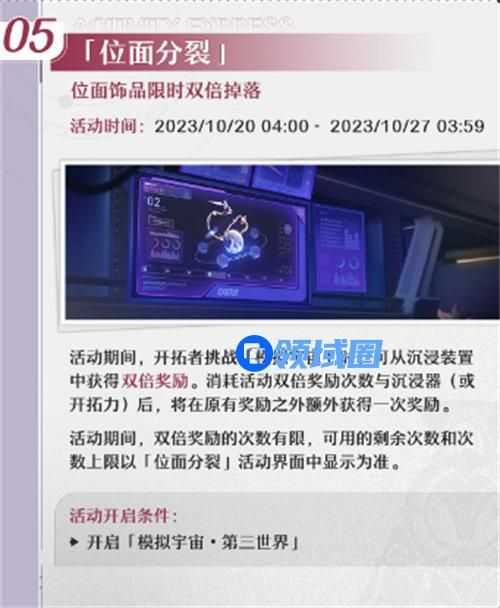 活动期间,开拓者挑战「模拟宇宙」时,可从沉浸装置中获得双倍奖励。消耗活动双倍奖励次数与沉浸器(或开拓力)后,将在原有奖励之外额外获得一次奖励。活动期间,双倍奖励的次数有限,可用的剩余次数和次数上限以「位面分裂」活动界面中显示为准。