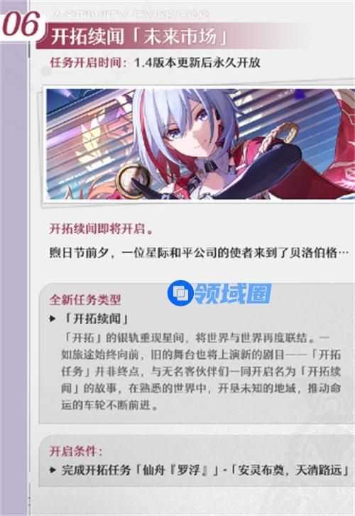 「开拓」的银轨重现星间,将世界与世界再度联结。一如旅途始终向前,旧的舞台也将上演新的剧目——「开拓任务」井非终点,与无名客伙伴们一同开启名为「开拓续闻」的故事,在熟悉的世界中,开垦未知的地域,推动命运的车轮不断前进。