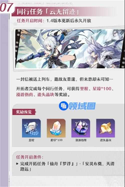 开拓者完成每个同行任务,可获得里程、星琼*100、漫游指南、遗失晶块等奖励。