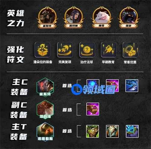 英雄之力建议选择崔斯特,由于阵容比较吃前排装备,可以说对装备要求较高,非常建议拿崔斯特第1个符文潘朵拉的装备,